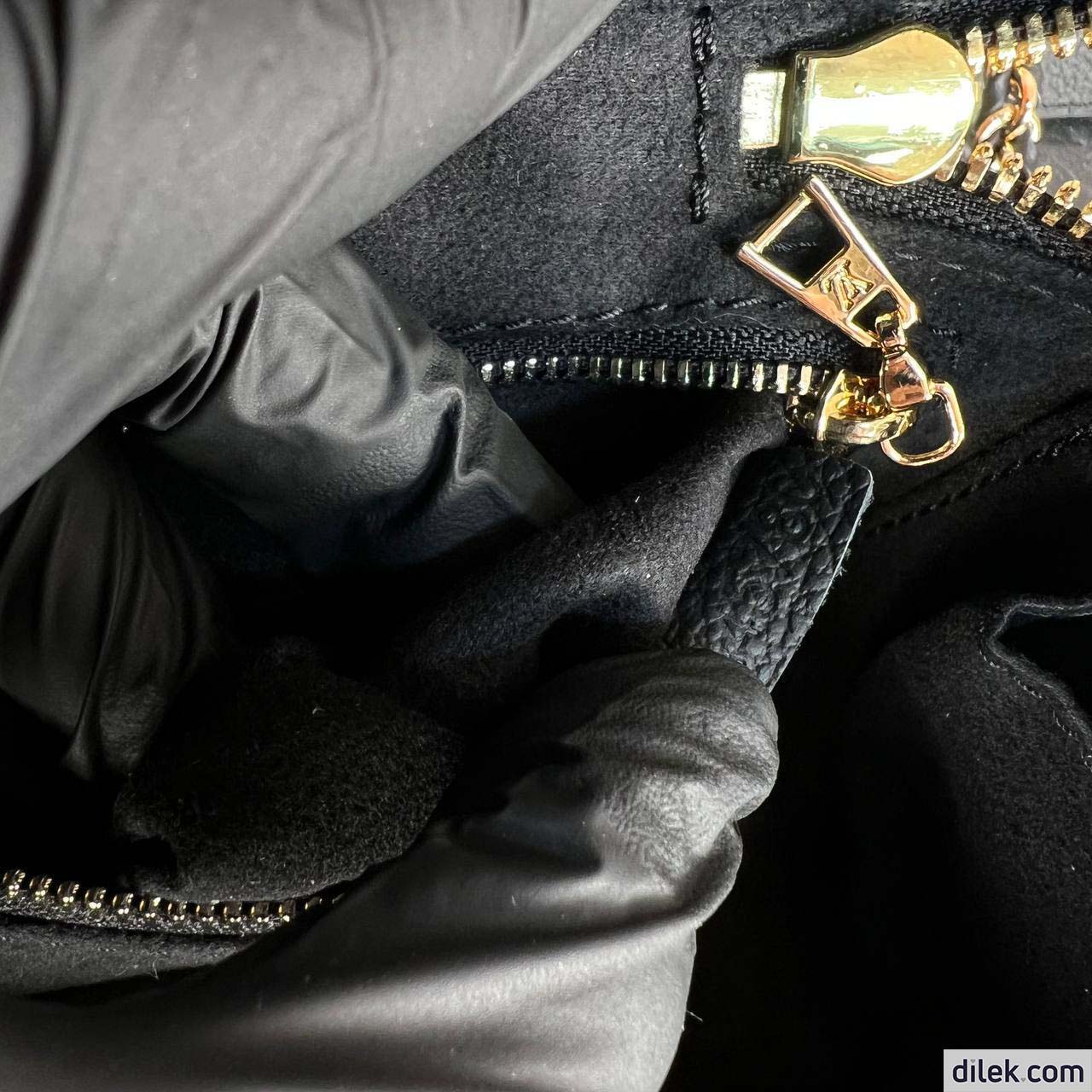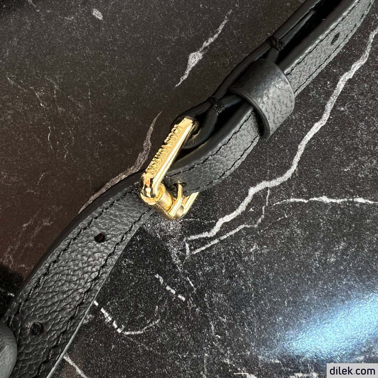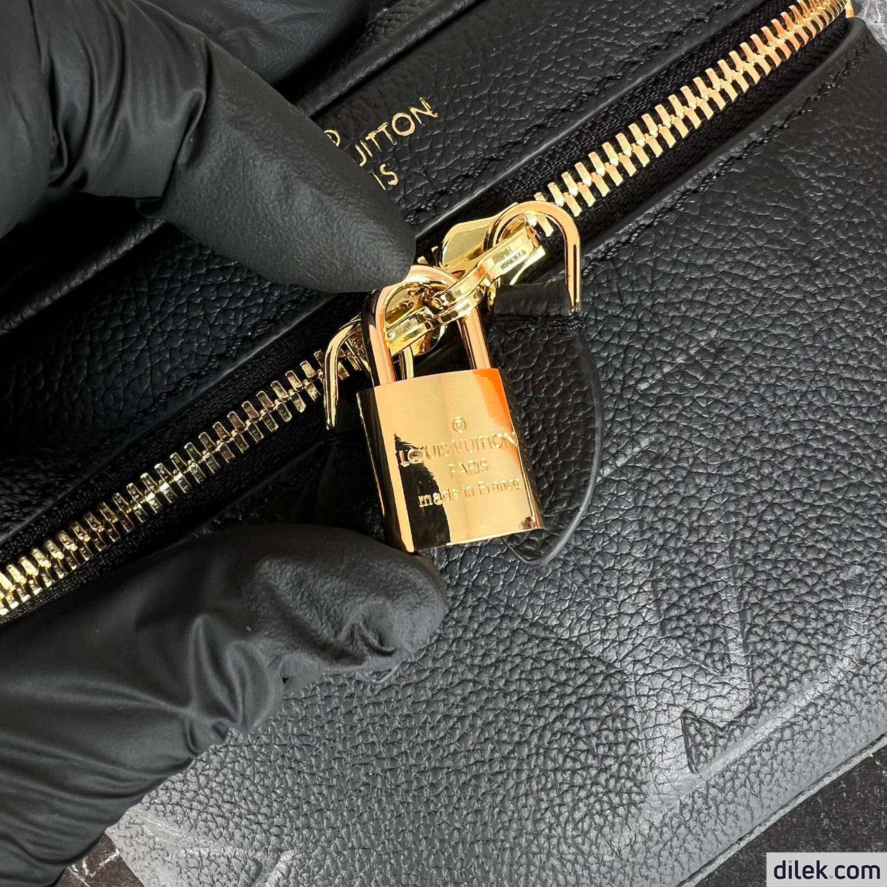 This Ink Vanity PM bag is of black leather with golden brass hardware and features monogram embossed black leather, black leather trim, a zip closure, a removable leather and chain strap, removable key clochette and top handle.