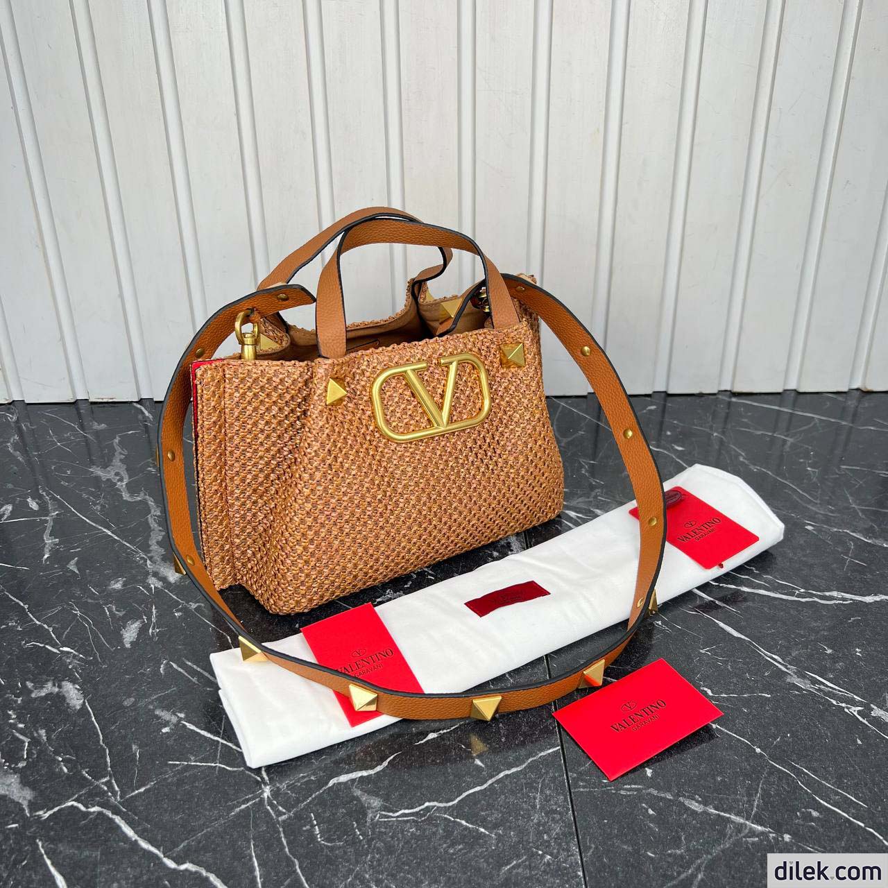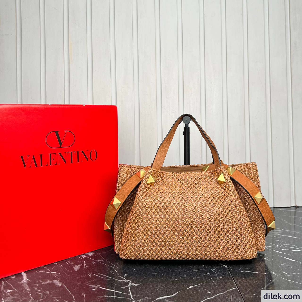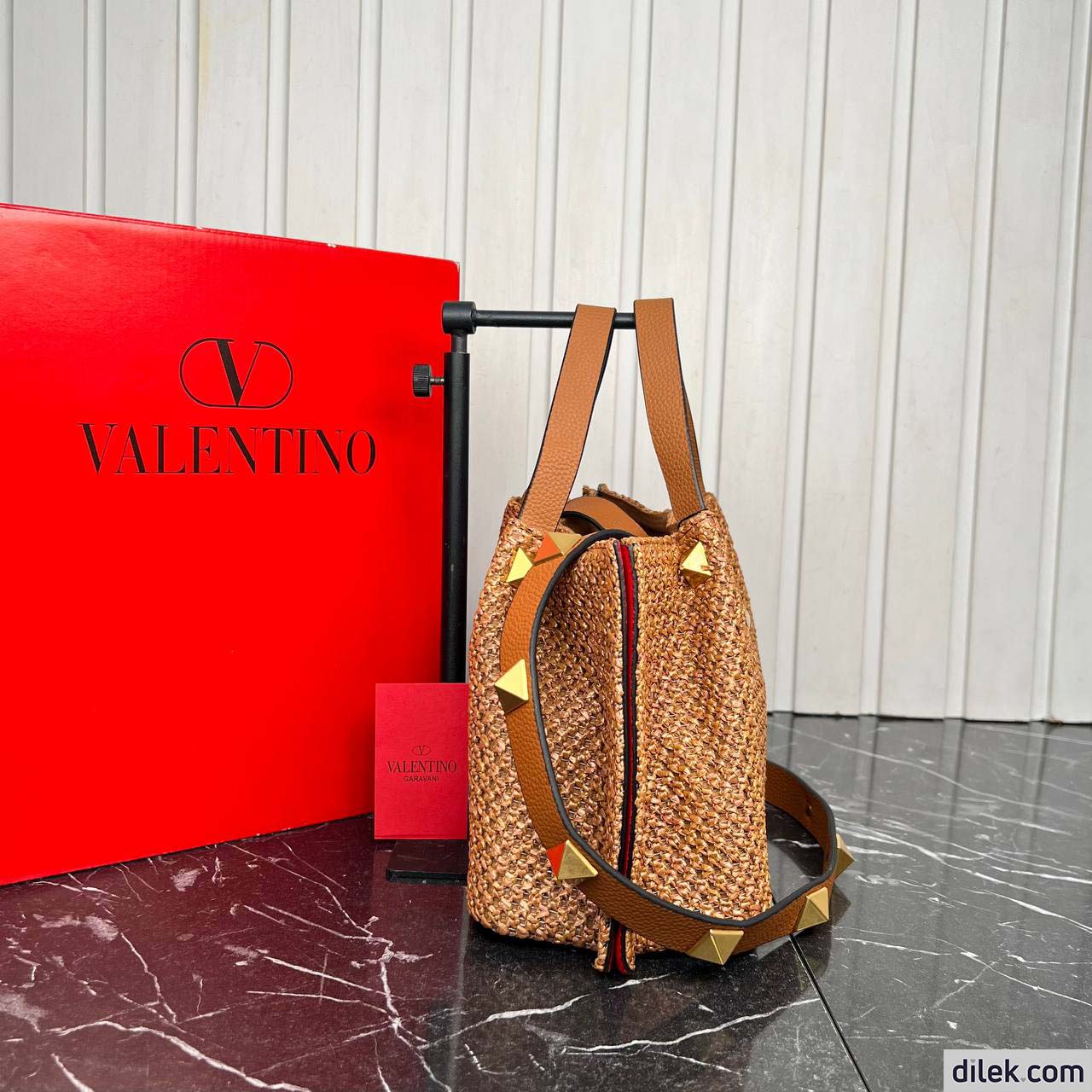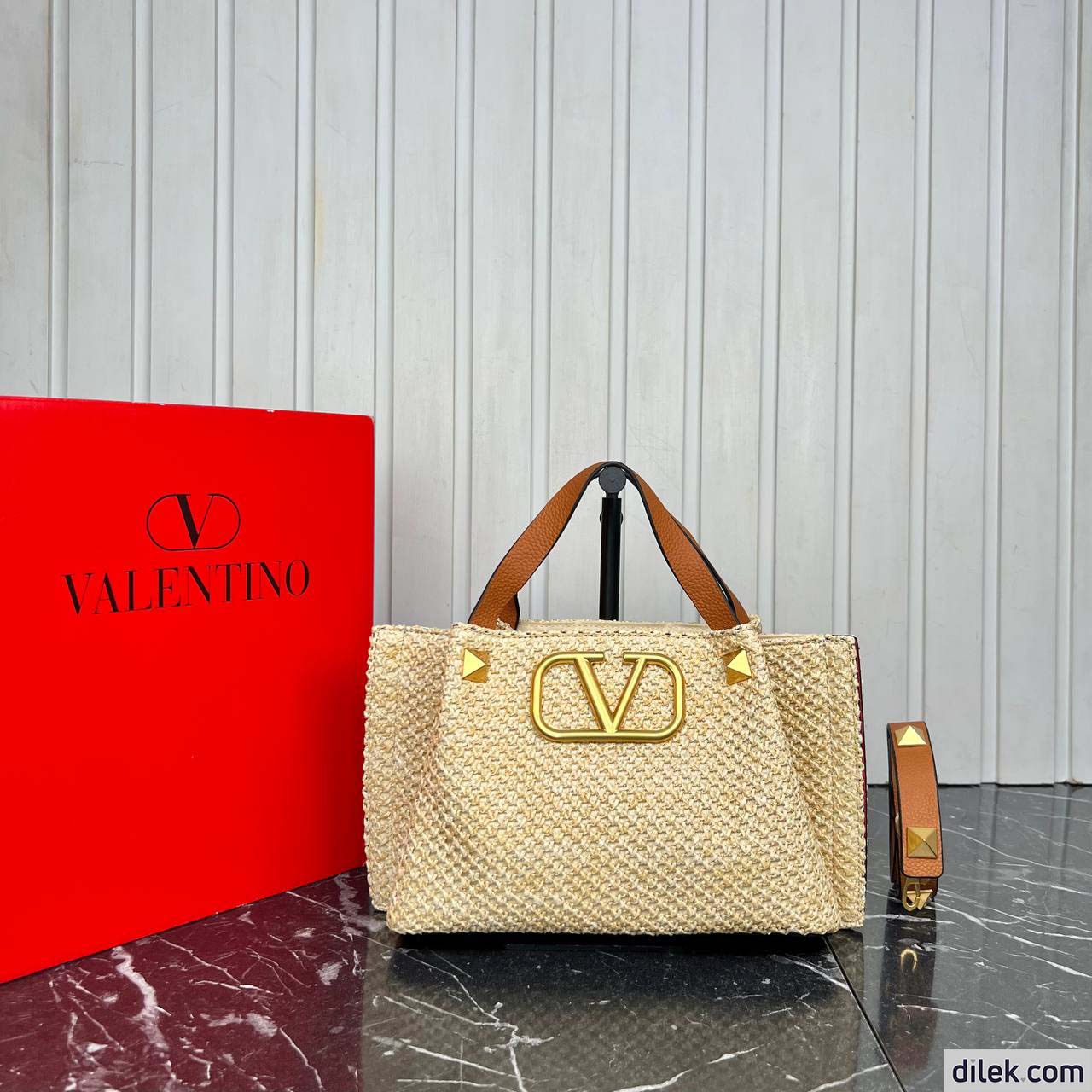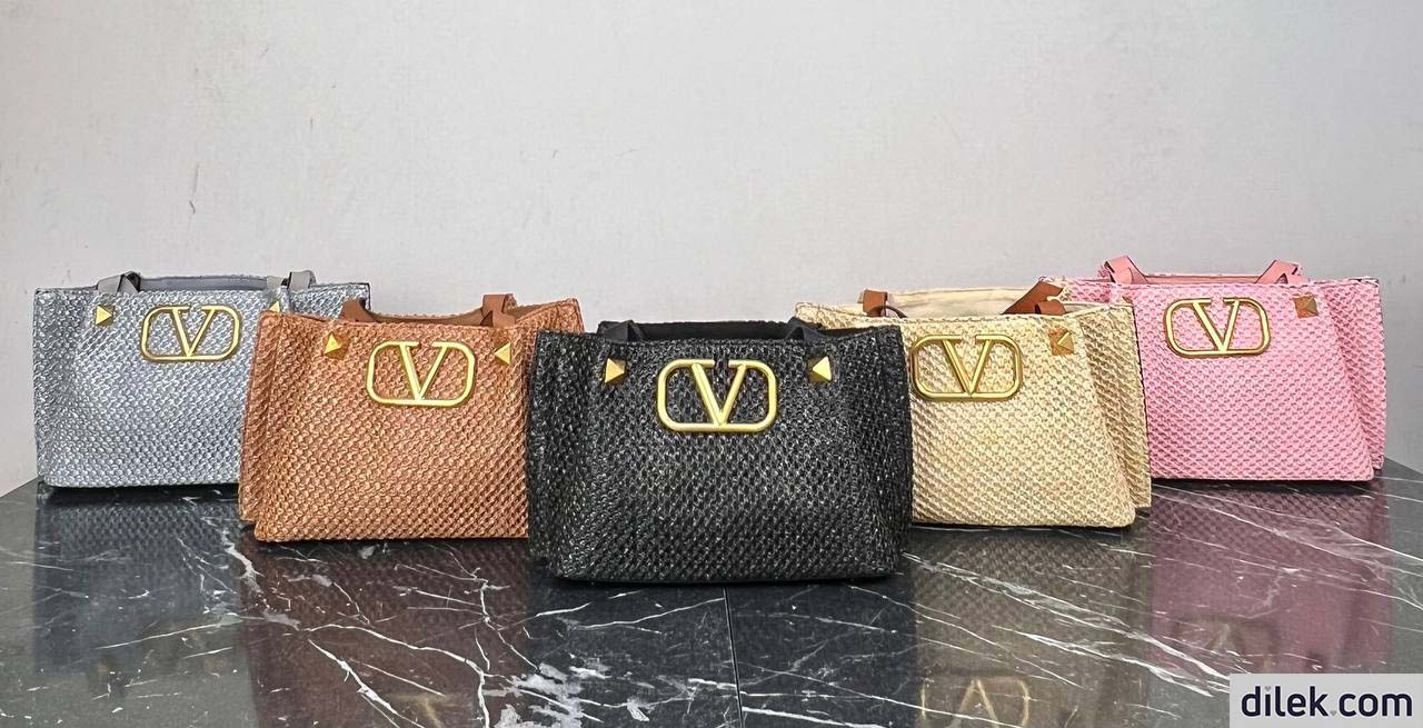 Valentino Garavani medium shopping bag in synthetic raffia featuring metal VLogo Signature and leather detail on the sides. The shoulder strap features the iconic maxi studs.