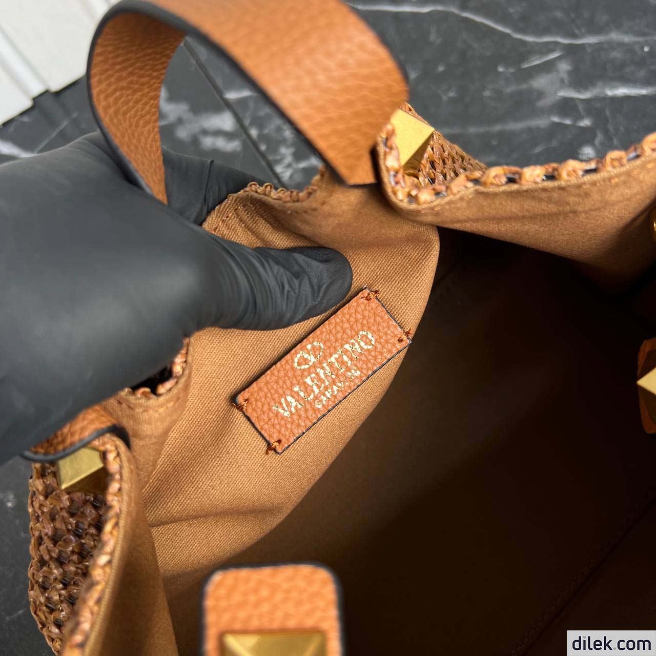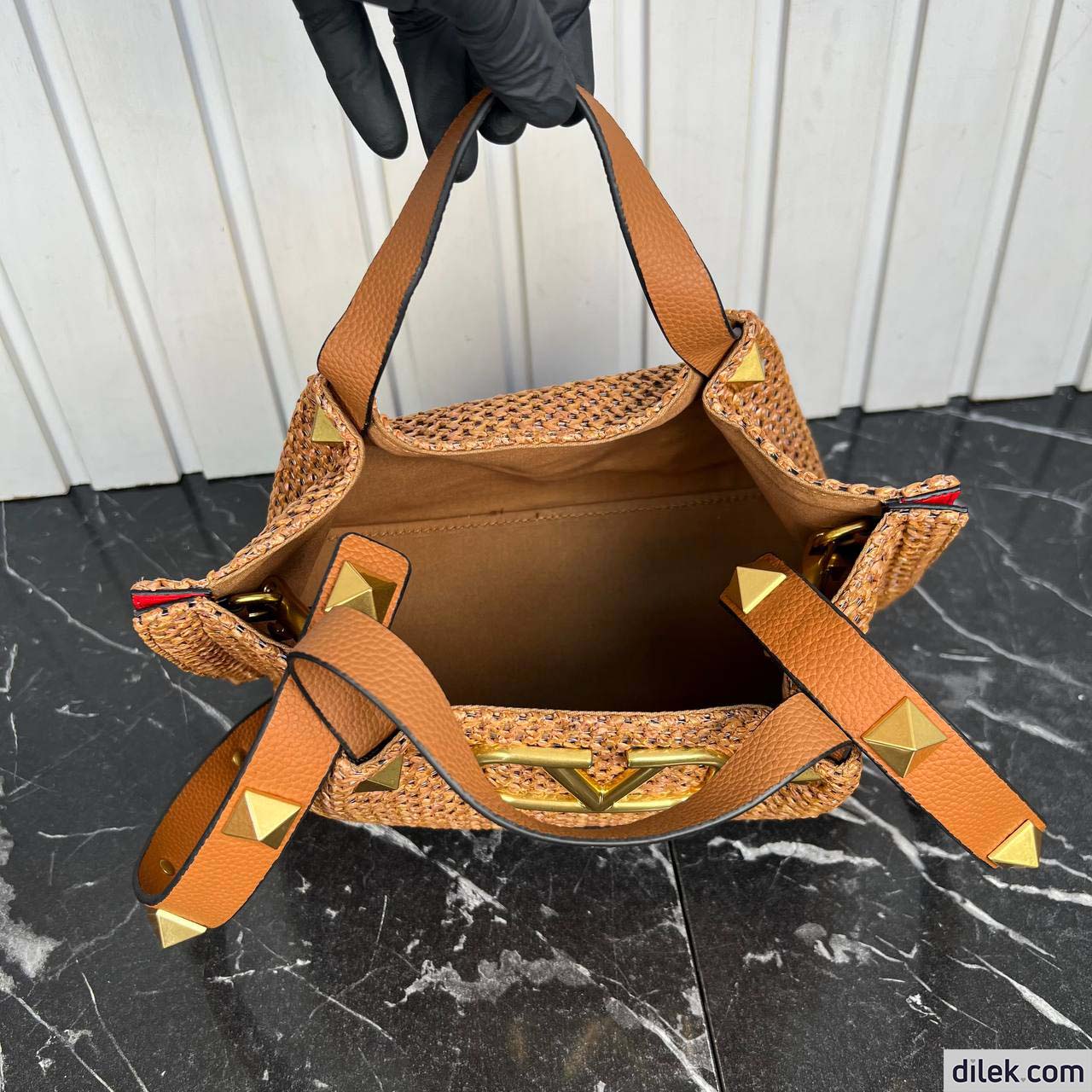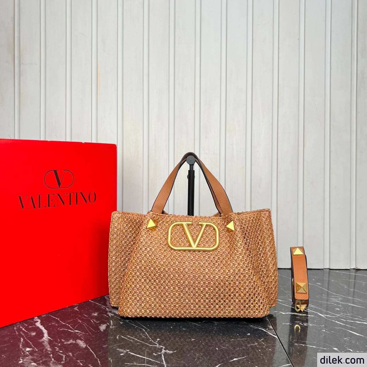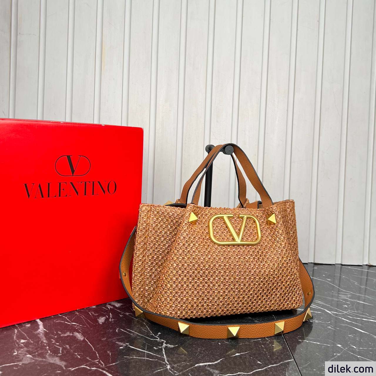 Valentino Garavani medium shopping bag in synthetic raffia featuring metal VLogo Signature and leather detail on the sides. The shoulder strap features the iconic maxi studs.