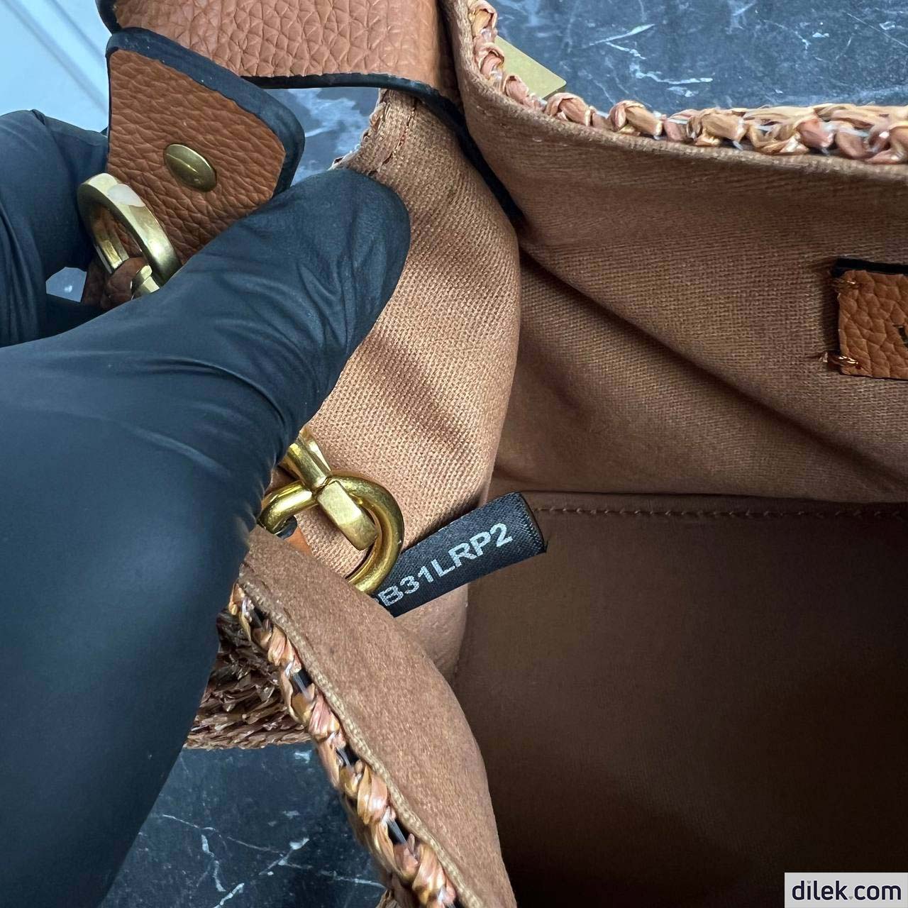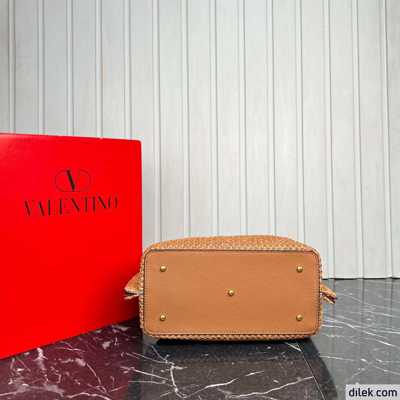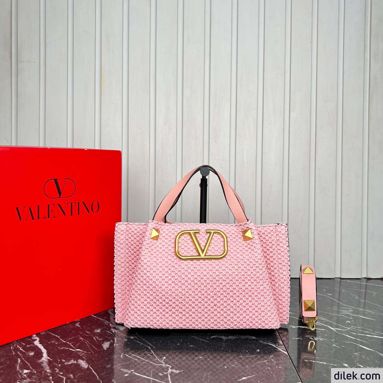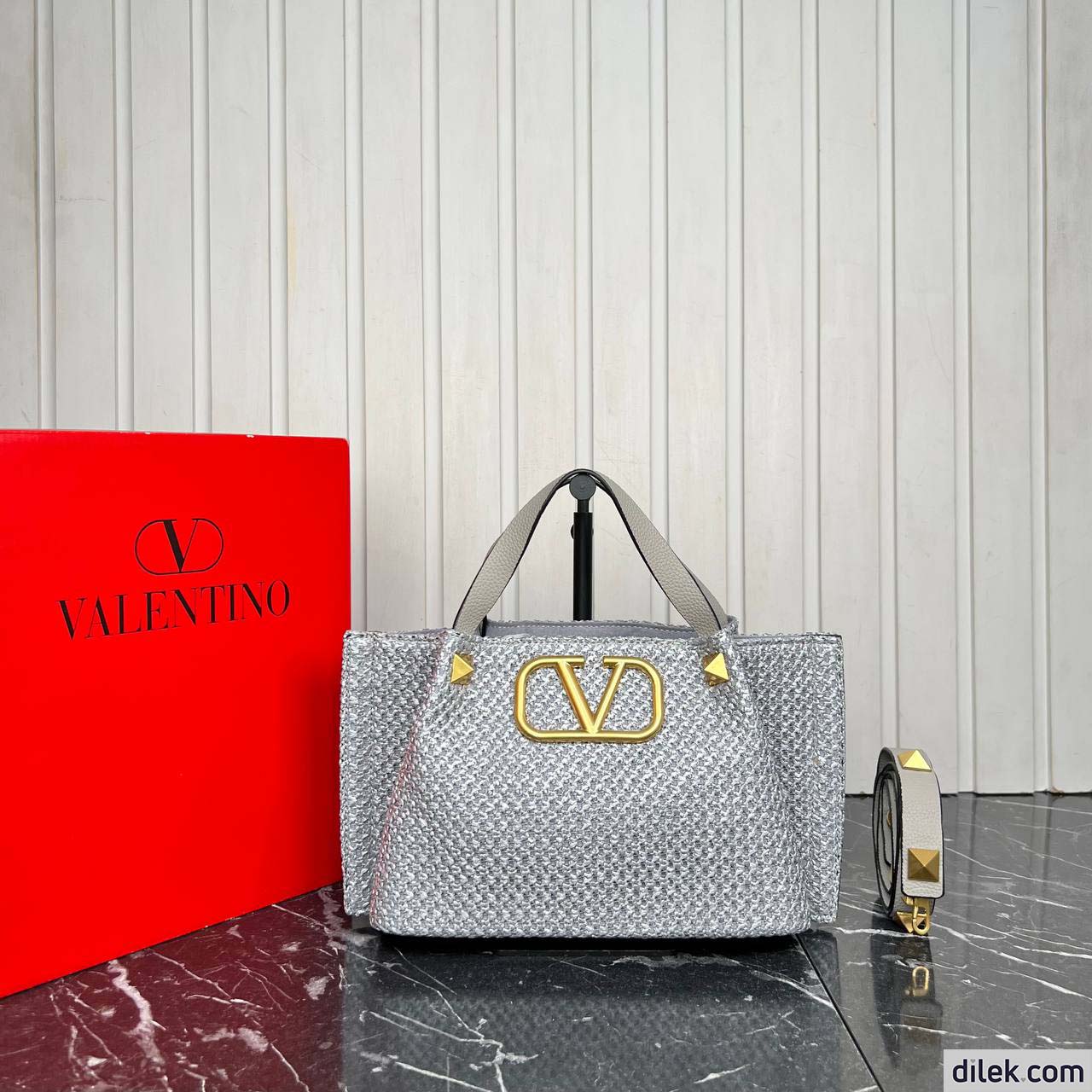 Valentino Garavani medium shopping bag in synthetic raffia featuring metal VLogo Signature and leather detail on the sides. The shoulder strap features the iconic maxi studs.