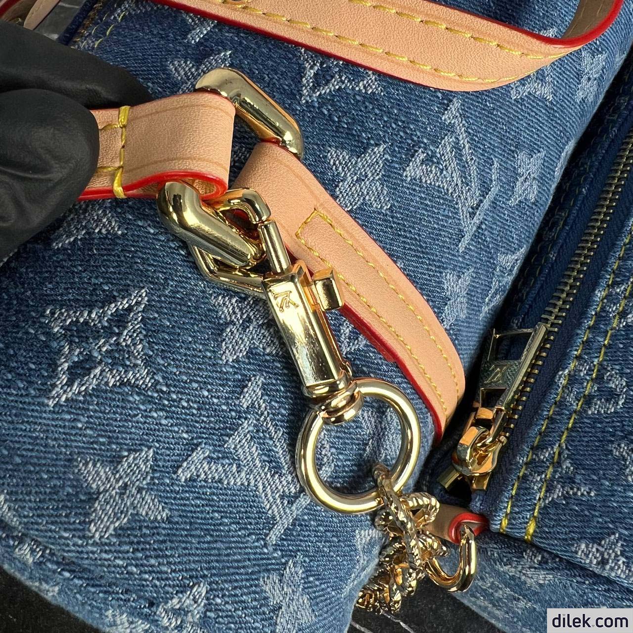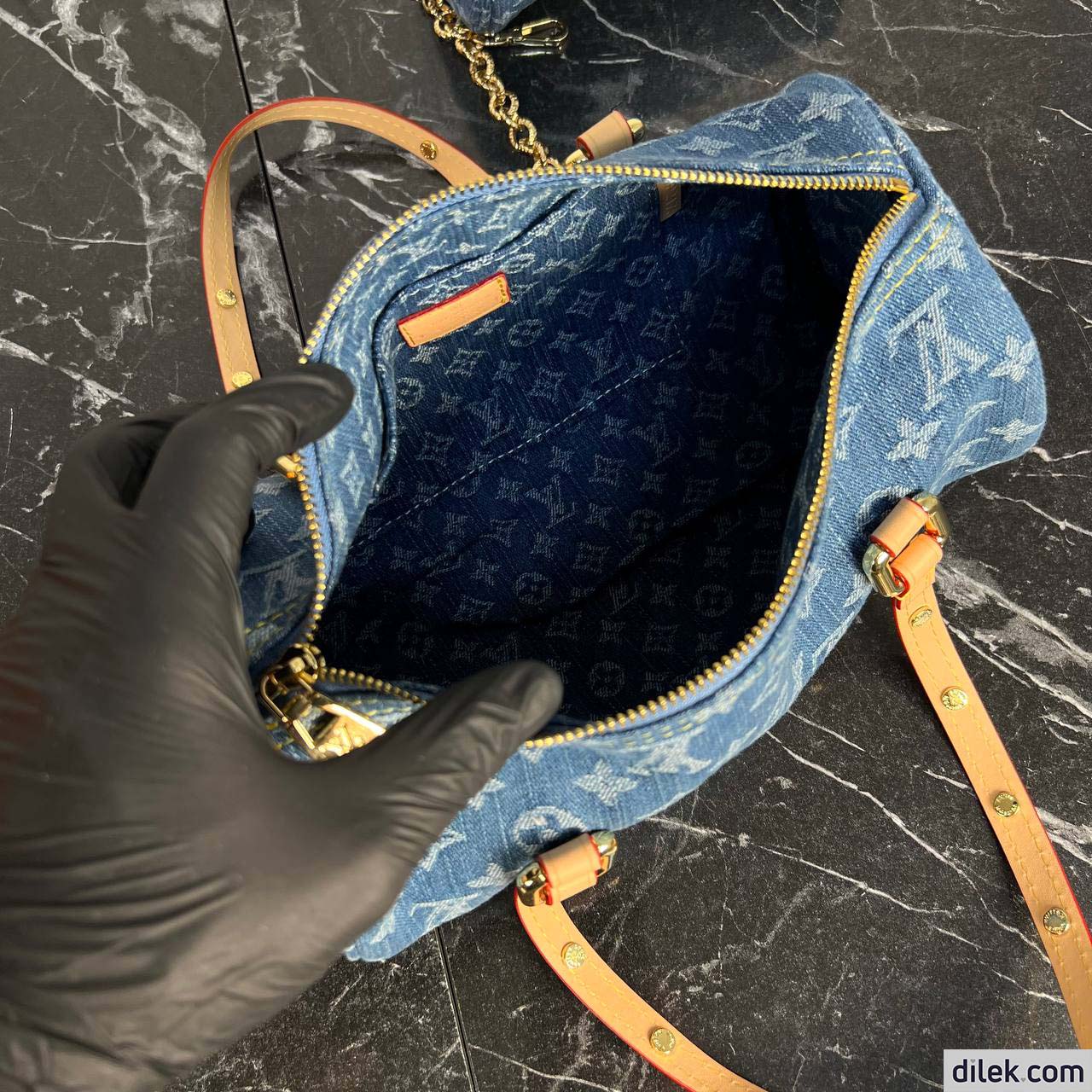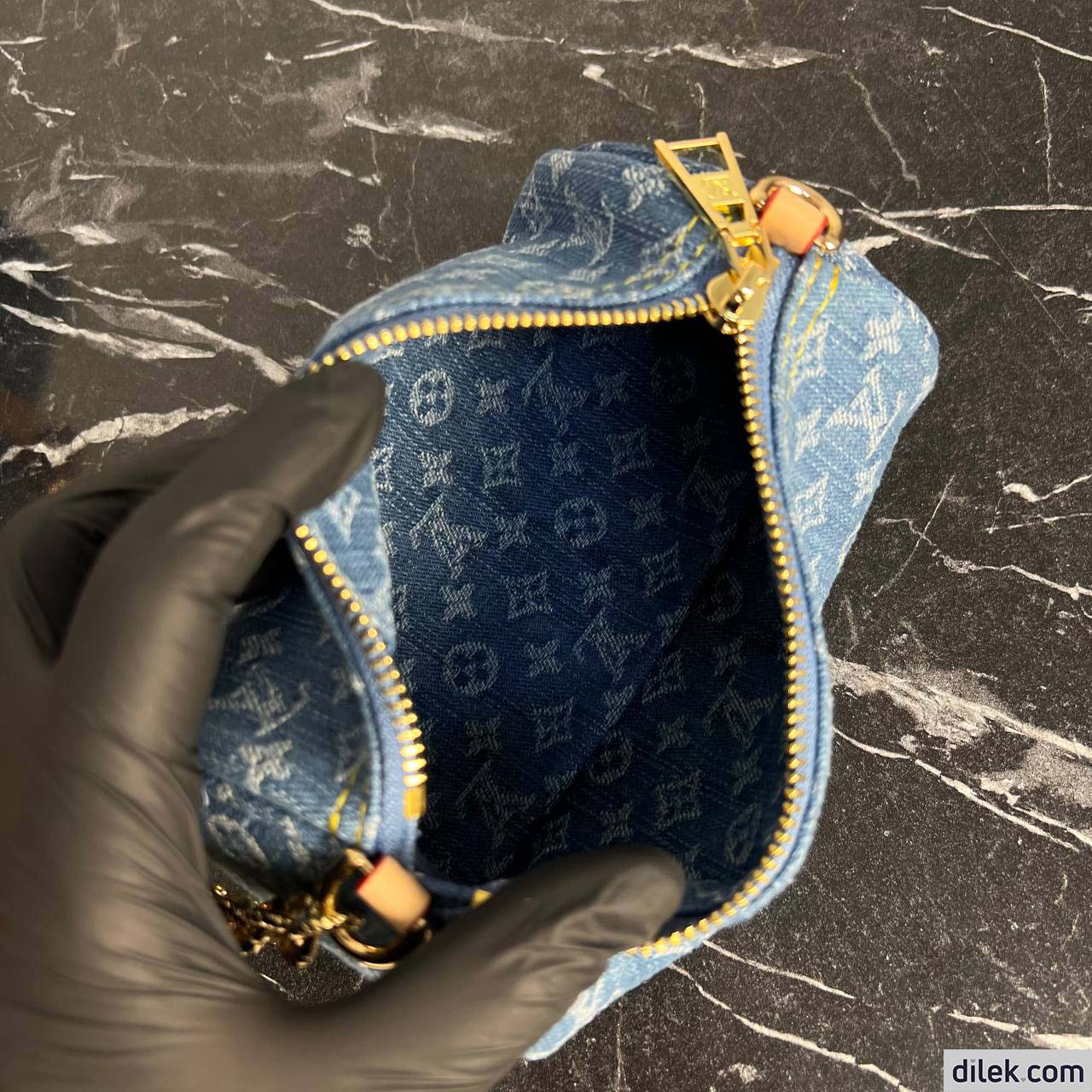 The Papillon handbag is made from Monogram Denim and features a miniature Papillon bag attached to the bag. Monogram Denim is created through a multi-step process that begins by weaving the Monogram motif into the cotton. Next the cotton is bleached and then the bag assembled. Finally the bag is stonewashed, making it unique.