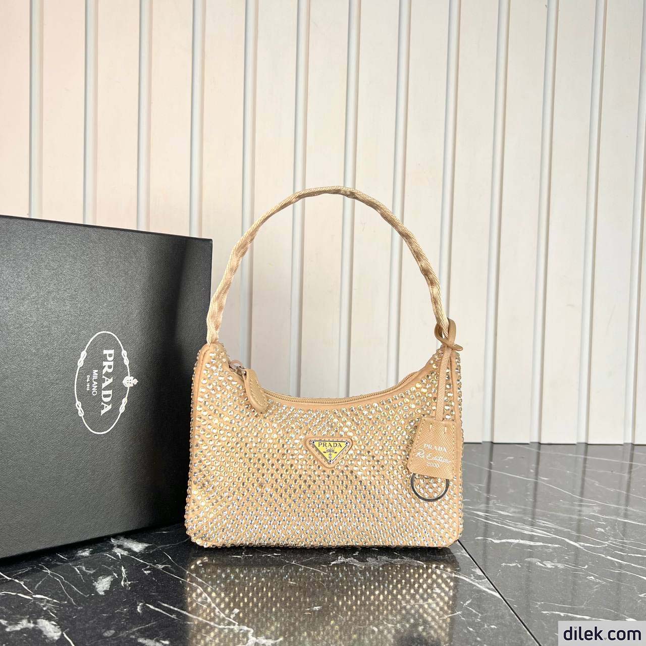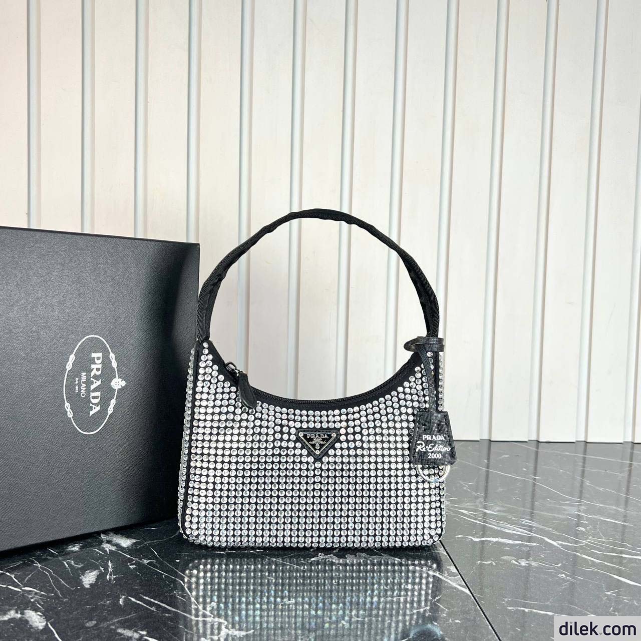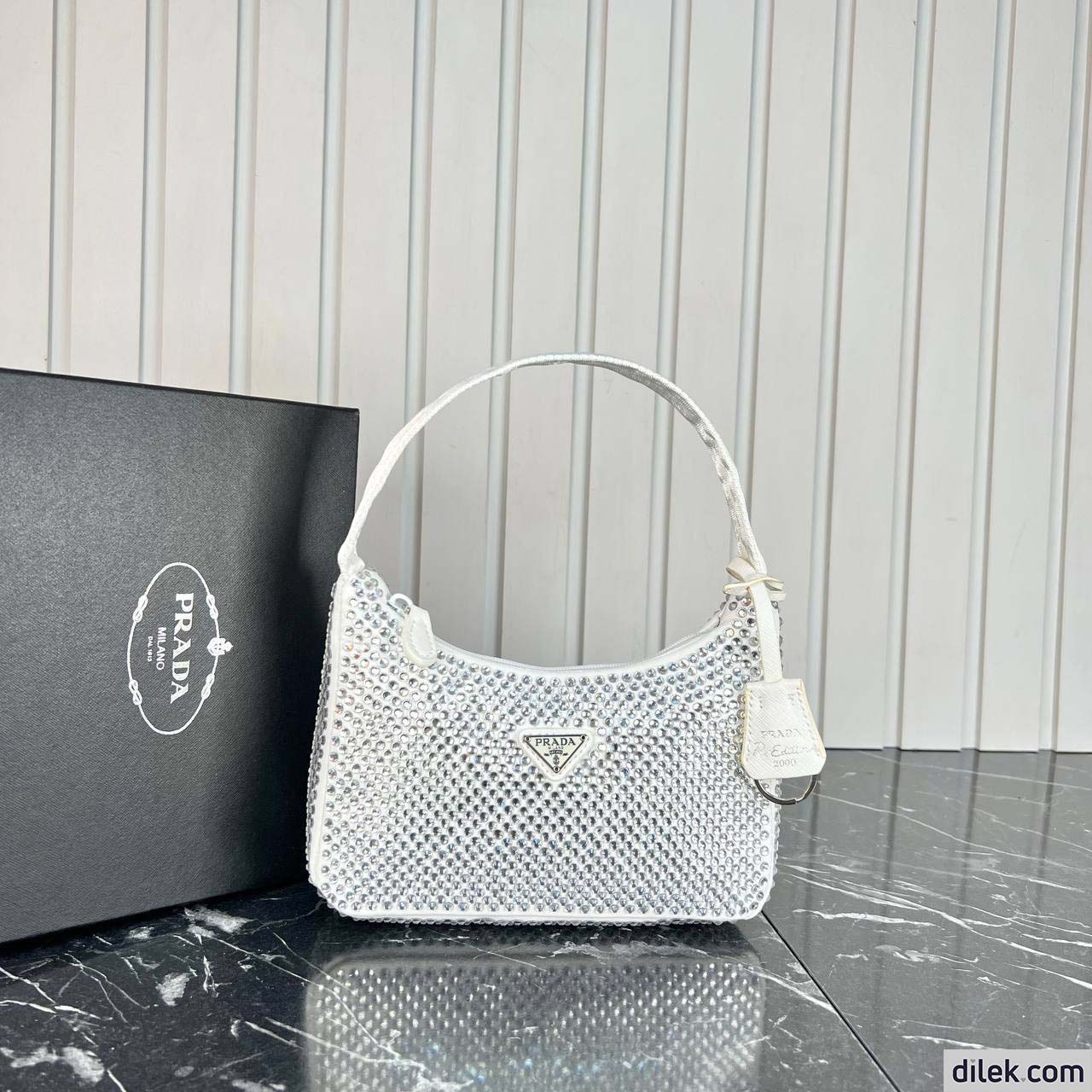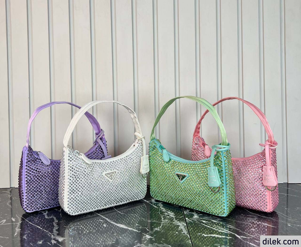 This mini hobo bag, an iconic Prada style, comes in a luxurious satin version studded with crystals and decorated with the emblematic enamel triangle logo.
