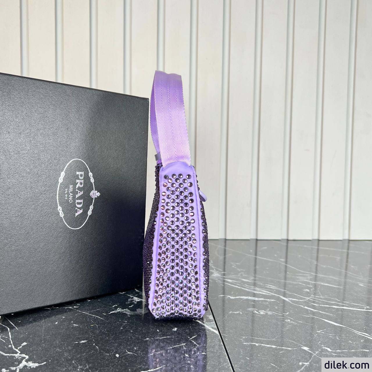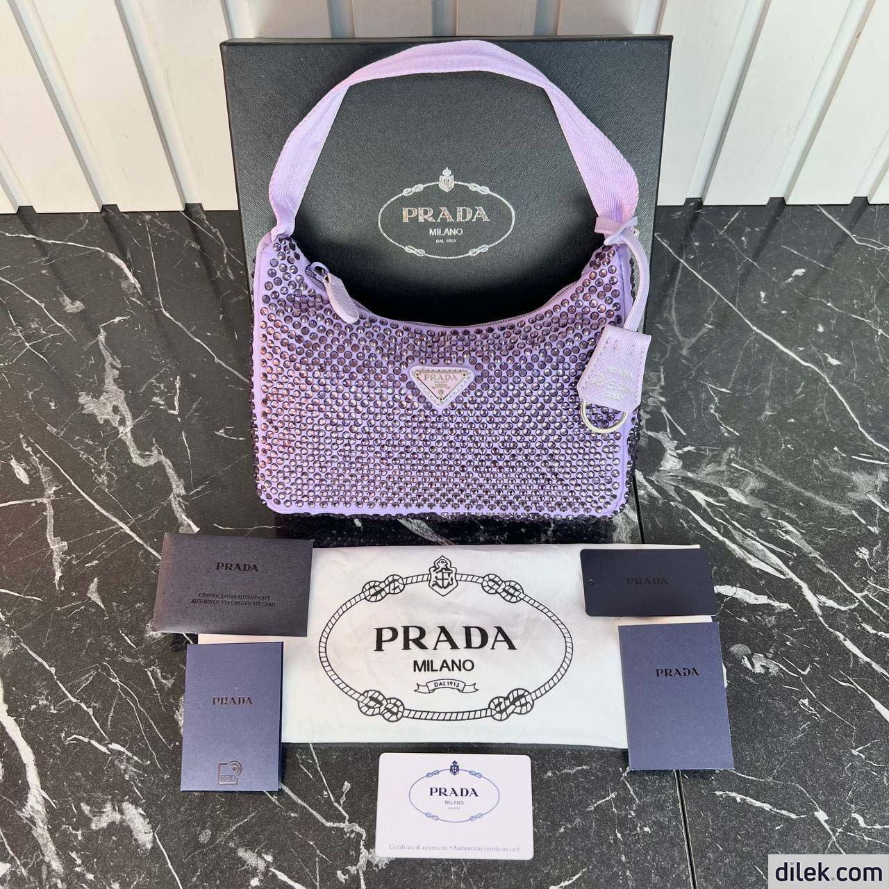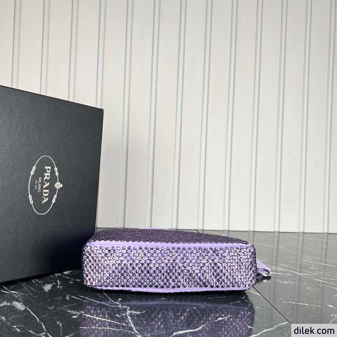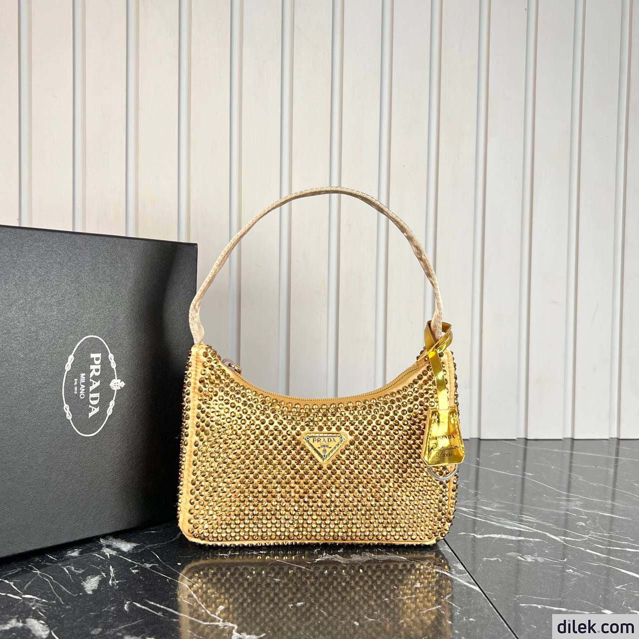This mini hobo bag, an iconic Prada style, comes in a luxurious satin version studded with crystals and decorated with the emblematic enamel triangle logo.
