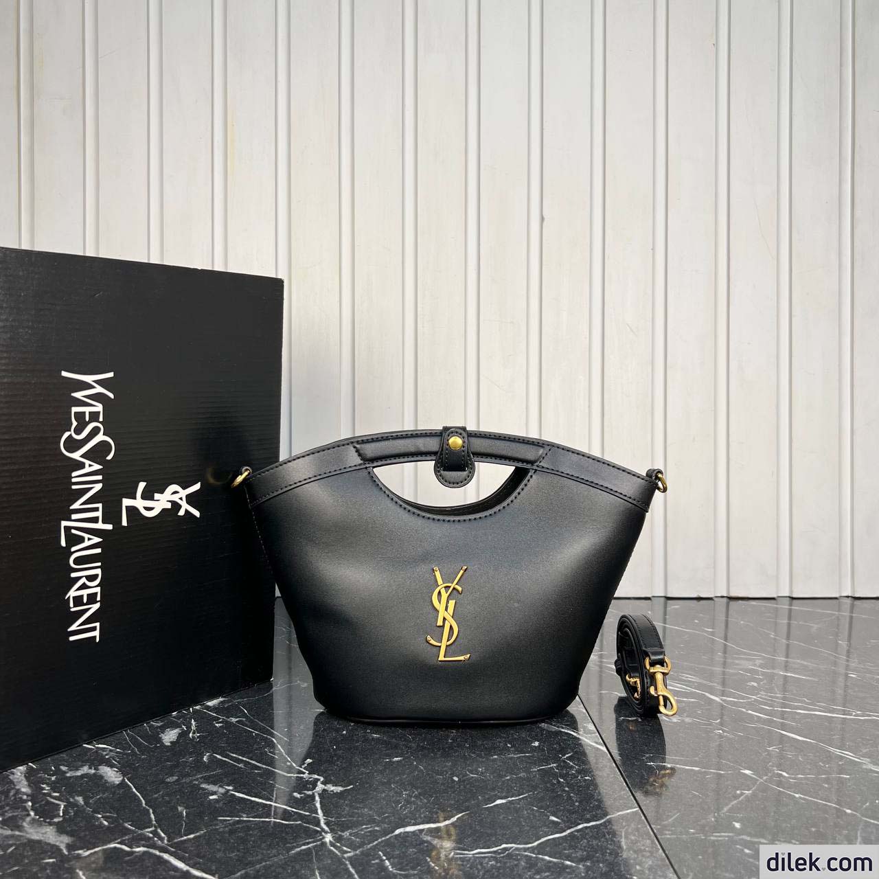 Structured tote bag fully lined in leather, decorated with the cassandre. This modern piece may be carried as a handbag or worn on the shoulder with a detachable strap.