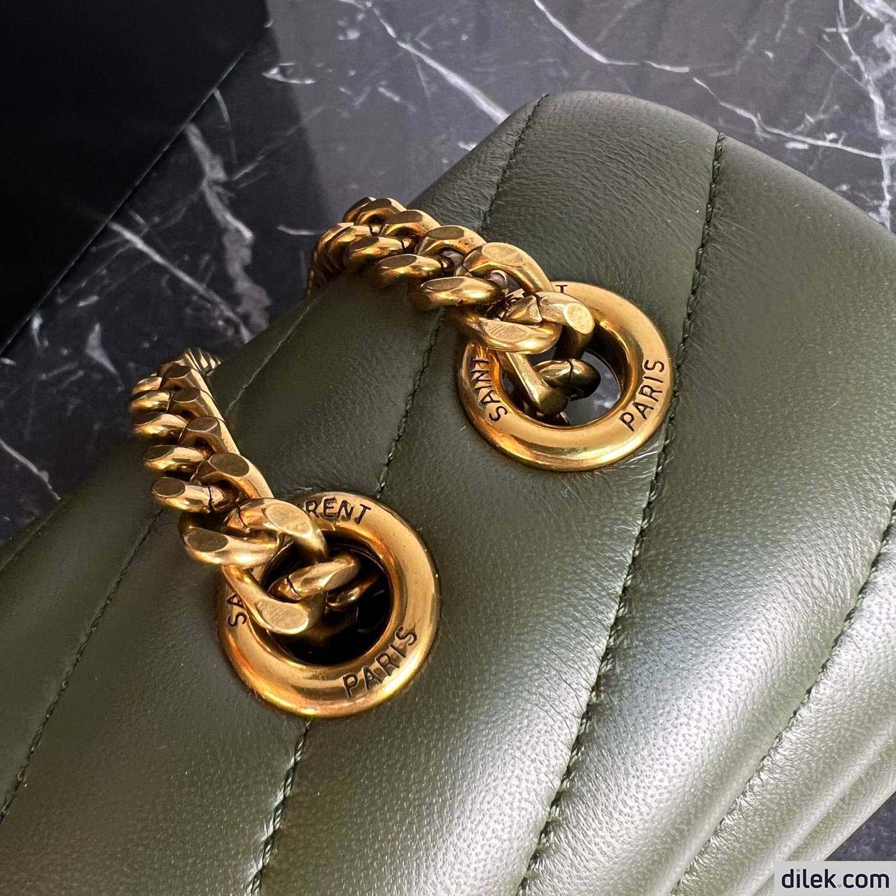 Envelope bag with iconic chevron quilt overstitching. Two spacious compartments separated by an interior zipped pocket Featuring a sliding chain that can be worn on the shoulder or crossbody.