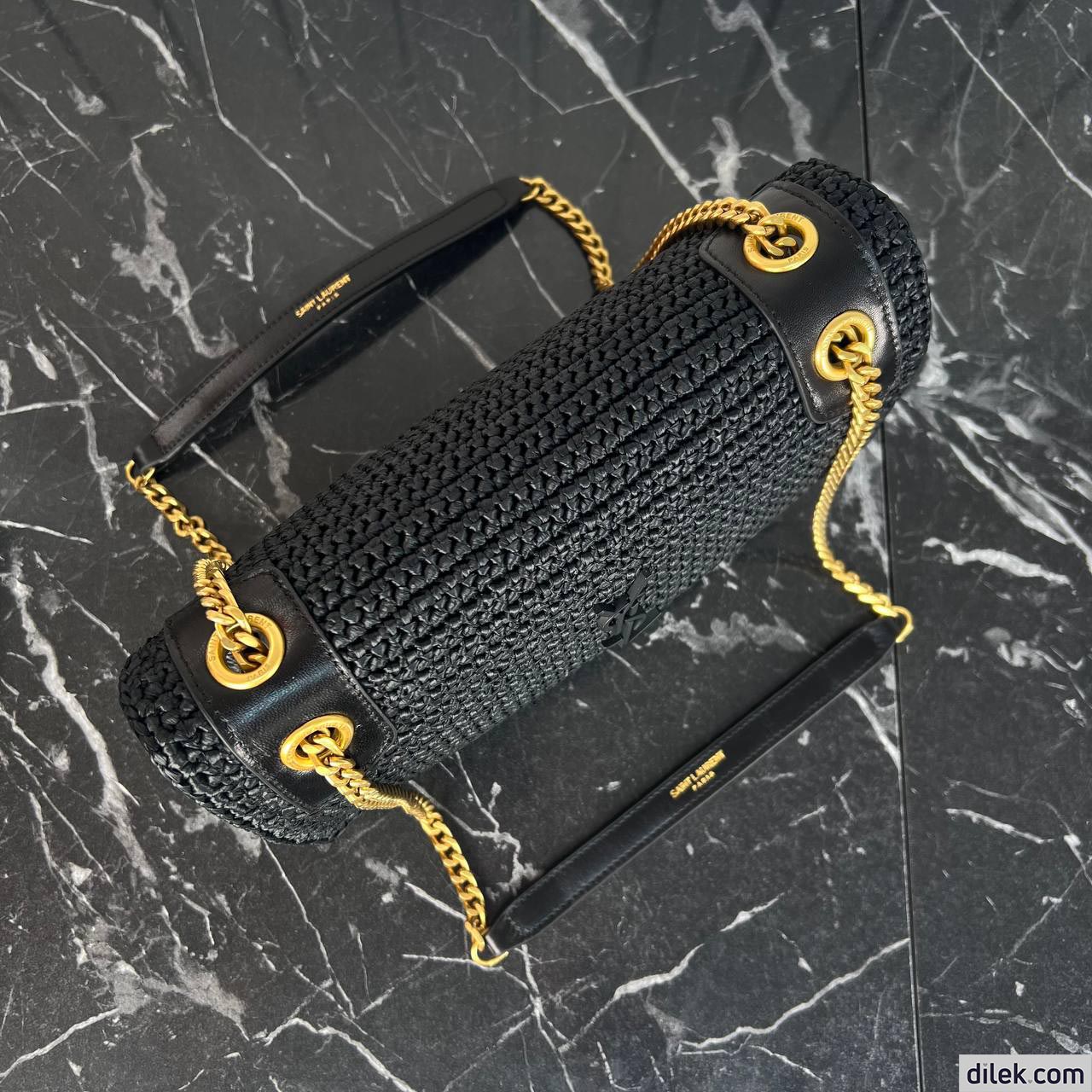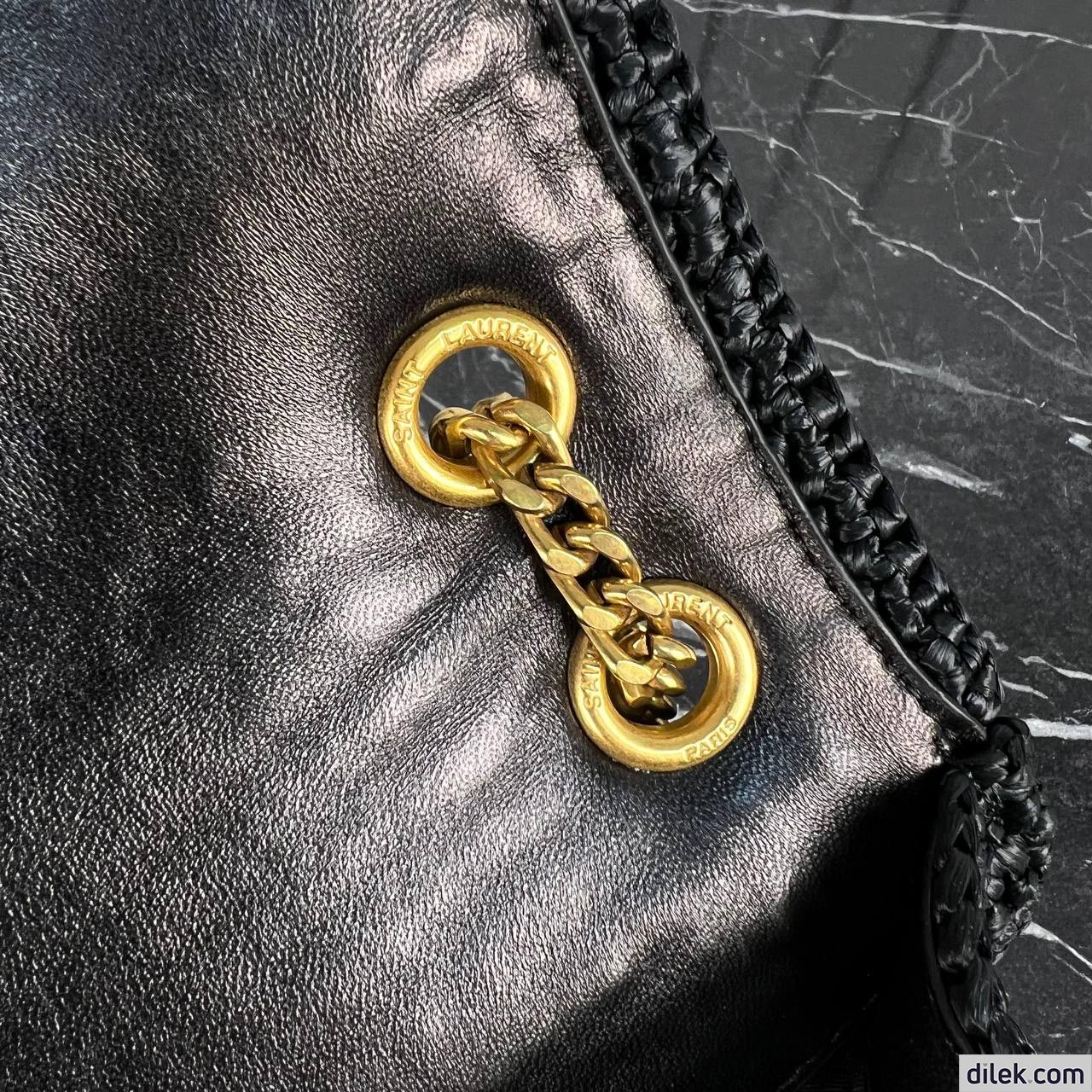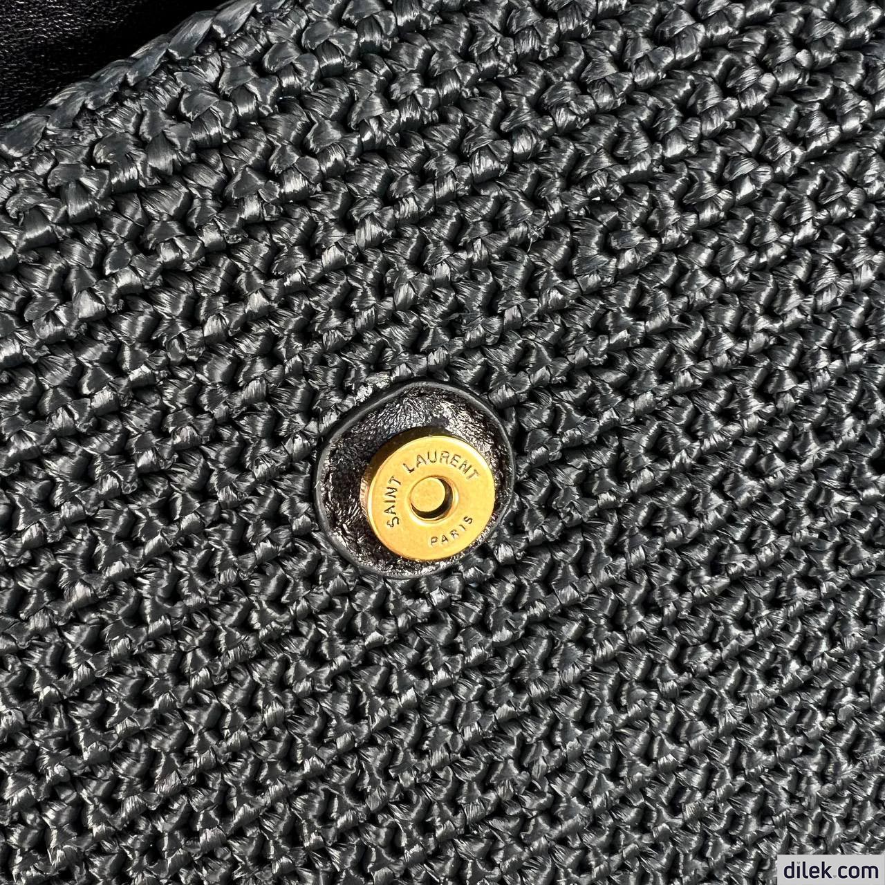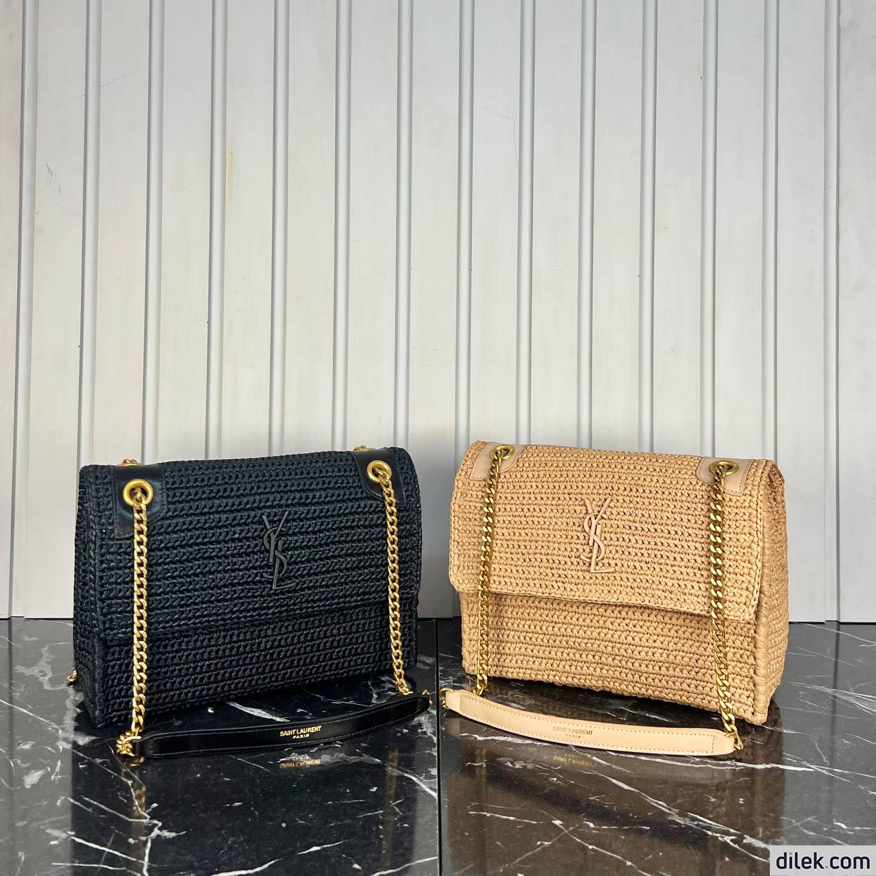 Saint Laurent's Niki bag is crafted of woven raffia. This luxurious piece is highlighted with YSL logo hardware and a sliding chain strap.