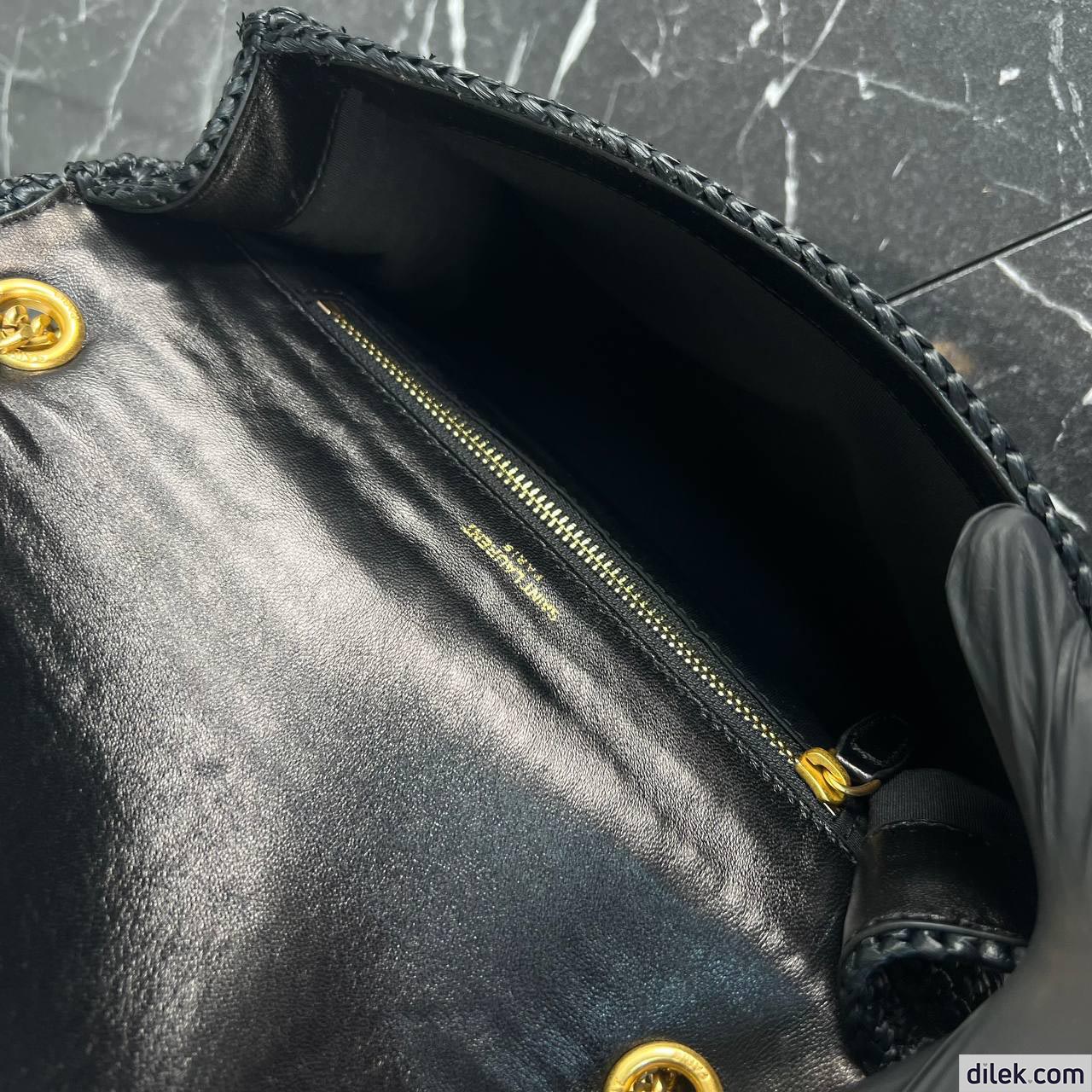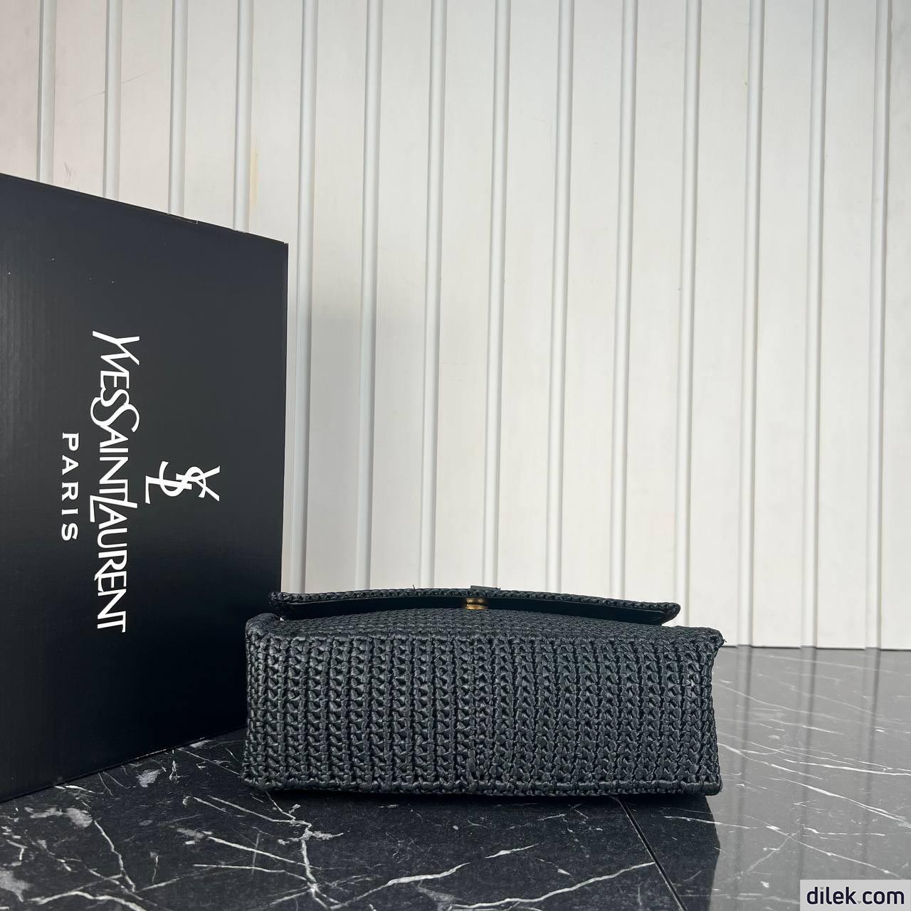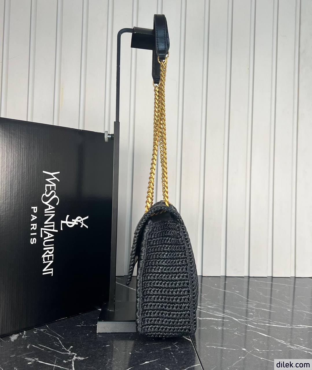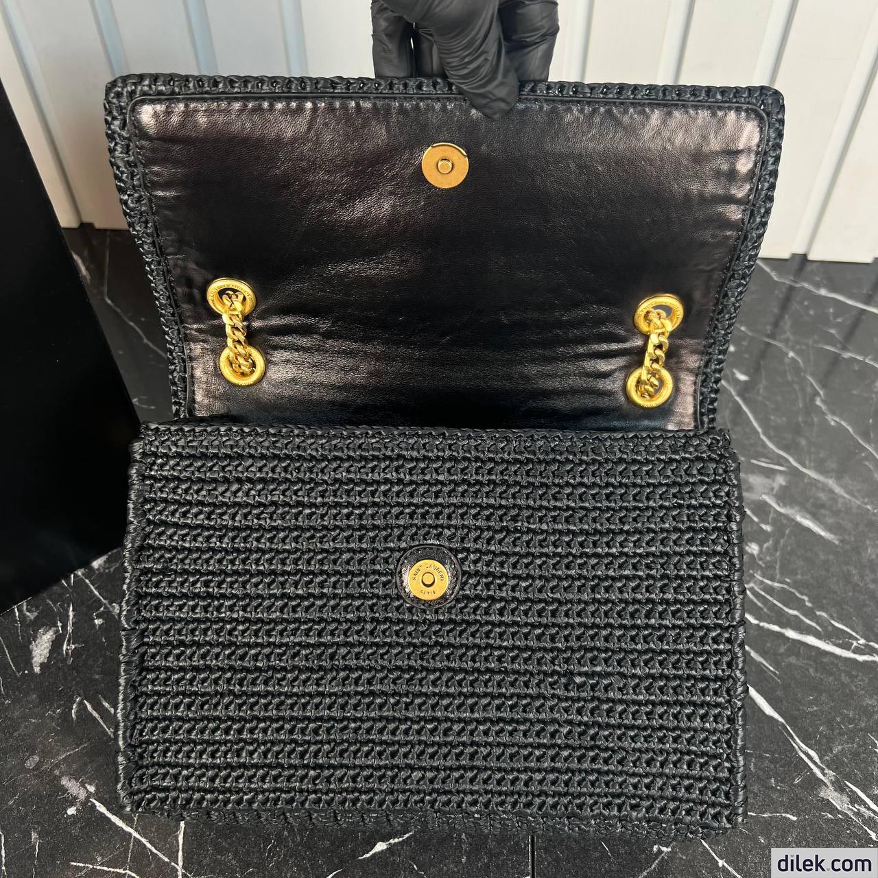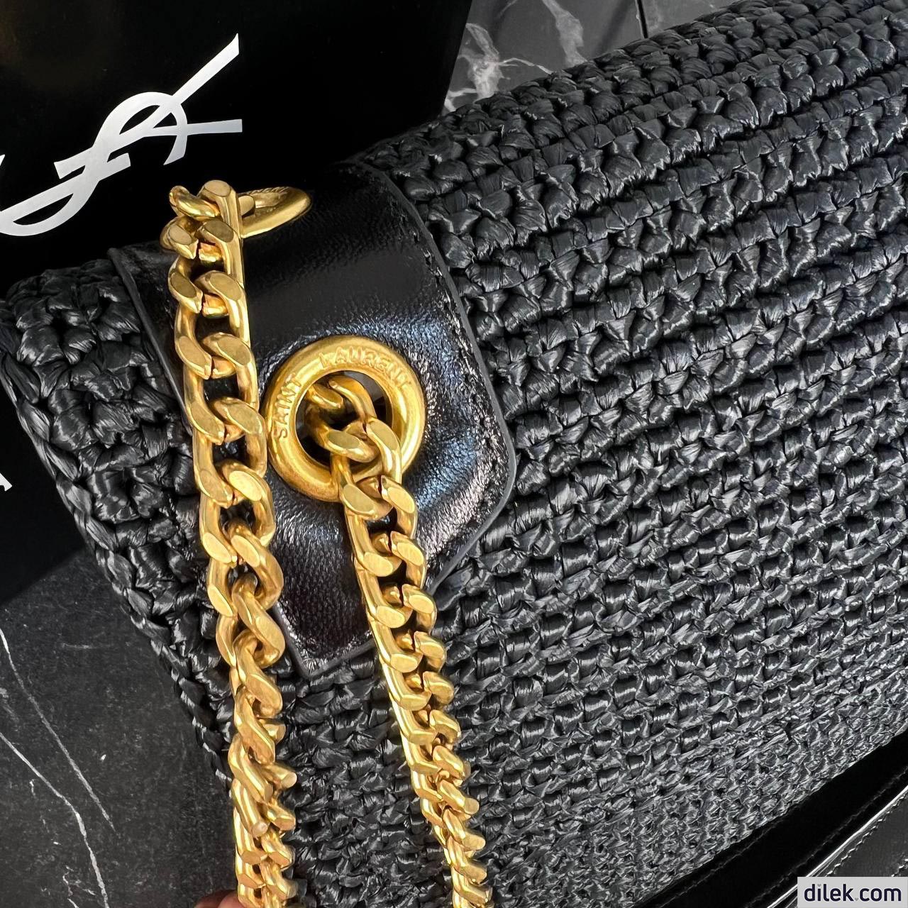 Saint Laurent's Niki bag is crafted of woven raffia. This luxurious piece is highlighted with YSL logo hardware and a sliding chain strap.