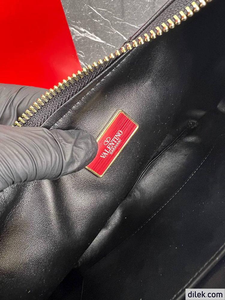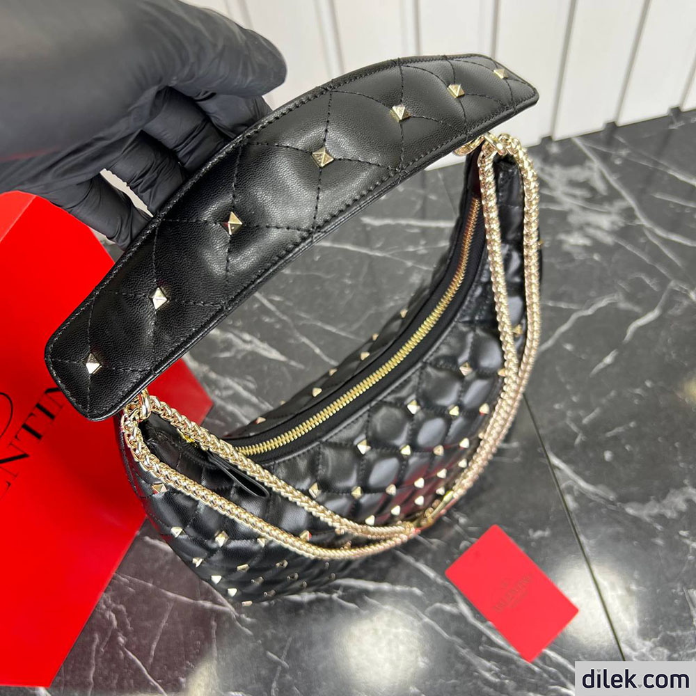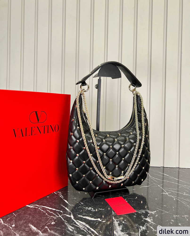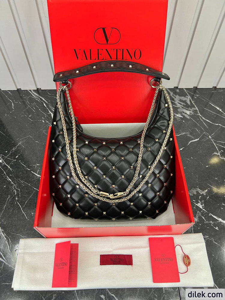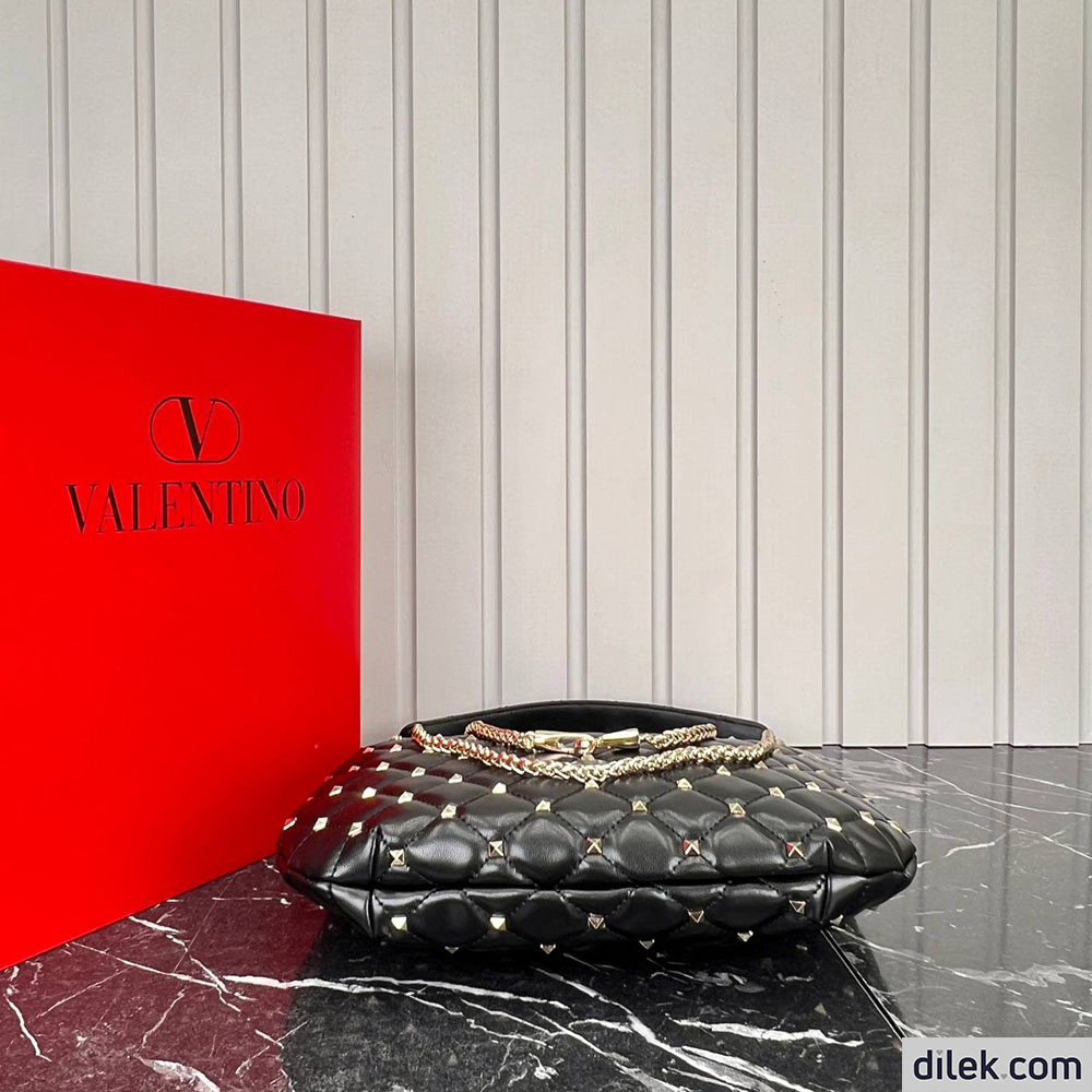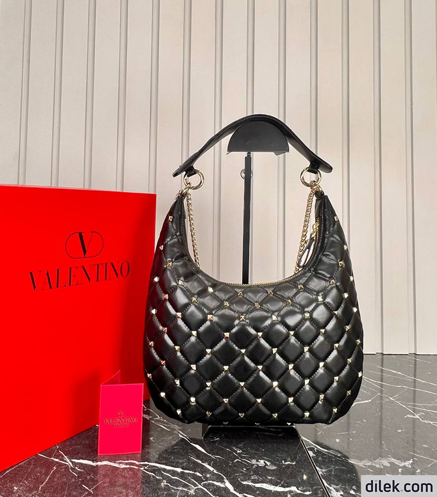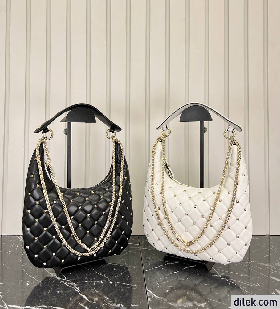 Valentino Garavani Rockstud hobo bag in grainy calfskin. The bag can be worn on the shoulder/crossbody thanks to the removable handle and shoulder strap.